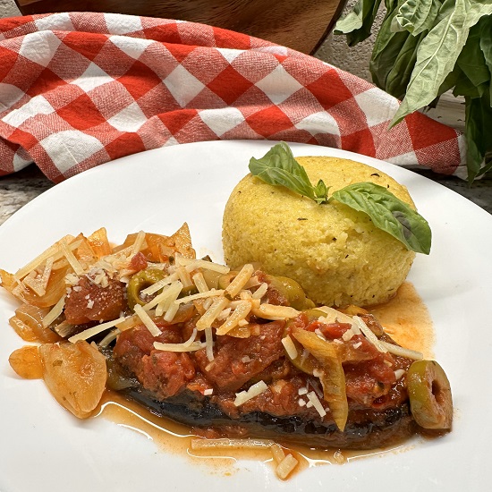 A grill press is used to put marks on the eggplant, The eggplant steaks are then smothered in grilled mushrooms topped with my version of a Puttanesca sauce. The eggplant is then baked until very tender.